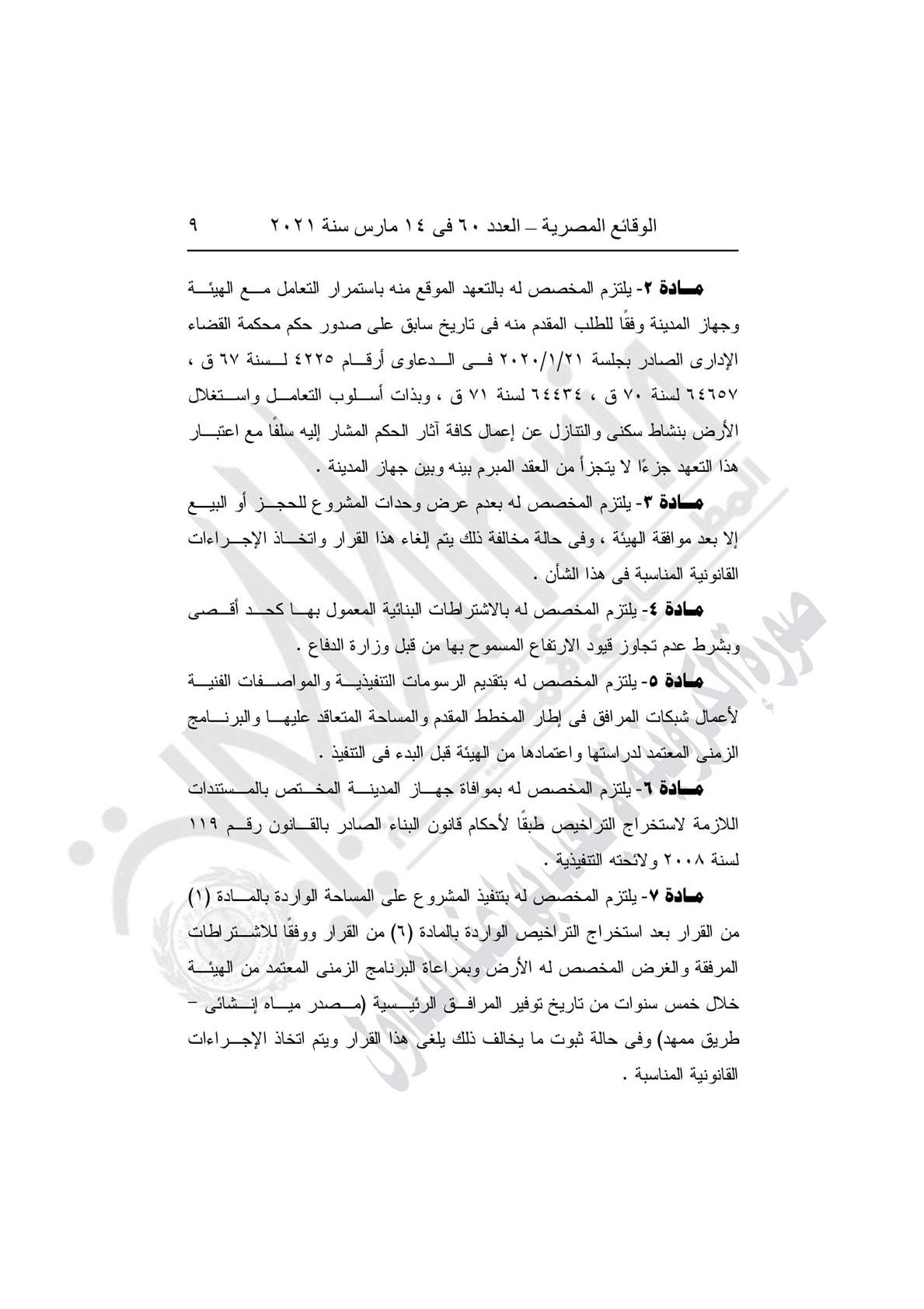 وجاء في المادة الثانية "يلتزم المخصص له بالتعهد الموقع منه باستمرار التعامل مع الهيئة وجهاز المدينة وفقًا للطلب المقدم منه فى تاريخ سابق على صدور حكم محكمة القضاء الإدارى الصادر بجلسة 21/1/2020 فى الدعاوى أرقام 4225 لسنة 67 ق ، 64657 لسنة 70 ق ، 64434 لسنة 71 ق ، وبذات أسلوب التعامل واستغلال الأرض بنشاط سكنى والتنازل عن إعمال كافة آثار الحكم المشار إليه سلفًا مع اعتبار هذا التعهد جزءًا لا يتجزأ من العقد المبرم بينه وبين جهاز المدينة".