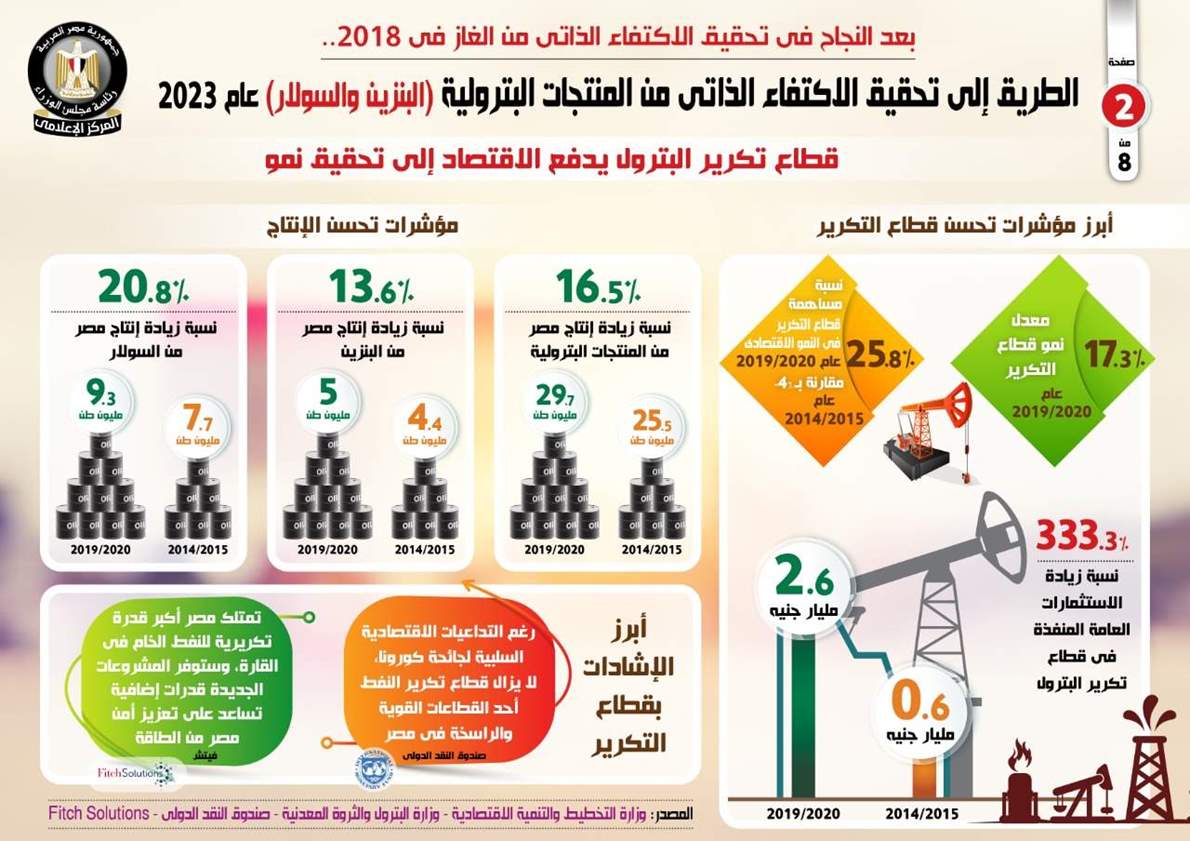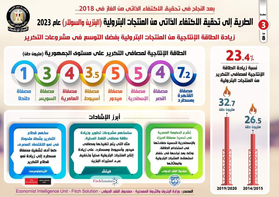 وفي هذا الصدد، أصدر المركز الإعلامي لمجلس الوزراء، تقريراً شمل إنفو جرافات تسلط الضوء على وصول مصر إلى الطريق لتحقيق الاكتفاء الذاتي من المنتجات البترولية (البنزين والسولار) عام 2023، وذلك بعد النجاح في تحقيق الاكتفاء الذاتي من الغاز في عام 2018.