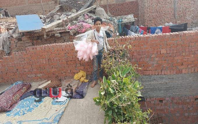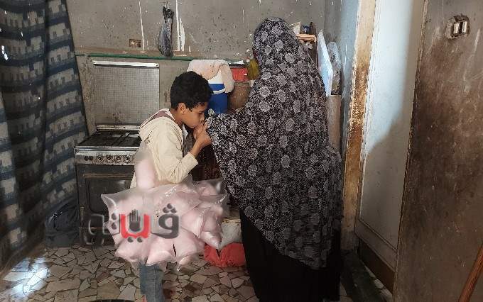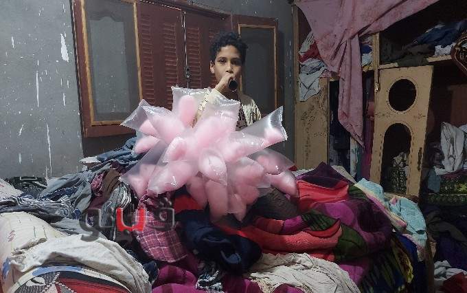 يوميا يخرج من بيته حاملا أكياس غزل البنات في يد، وفي الأخرى مزمار يجول الشوارع به، للفت انتباه أقرانه من الأطفال الذين يعيشون ظروفا طبيعية وحثهم على شراء كيس ثمنه جنيه واحد.