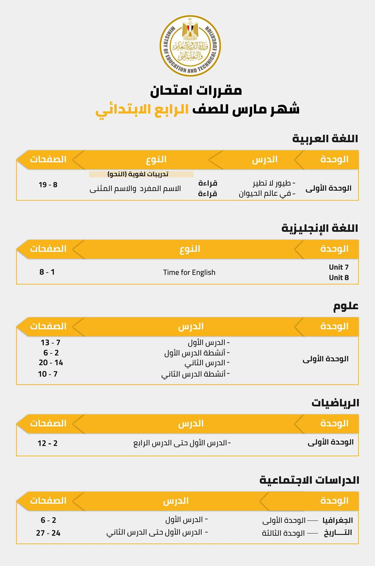 مقررات امتحان شهر مارس لطلاب الصف الرابع الابتدائي