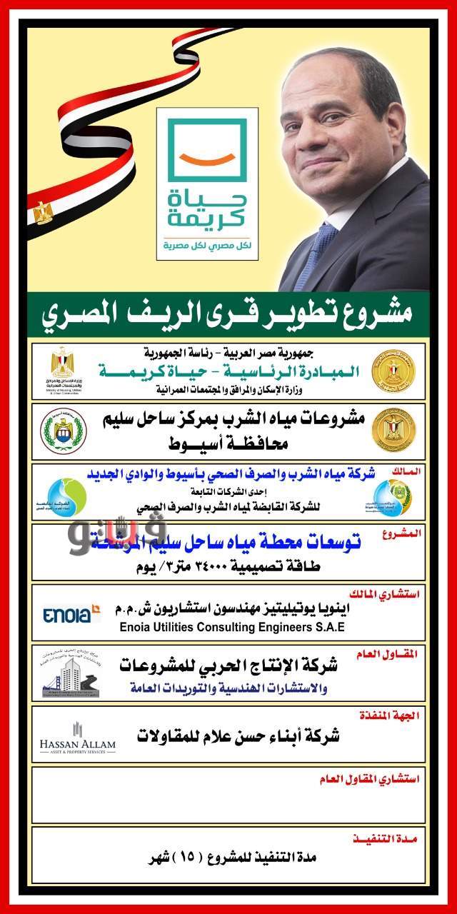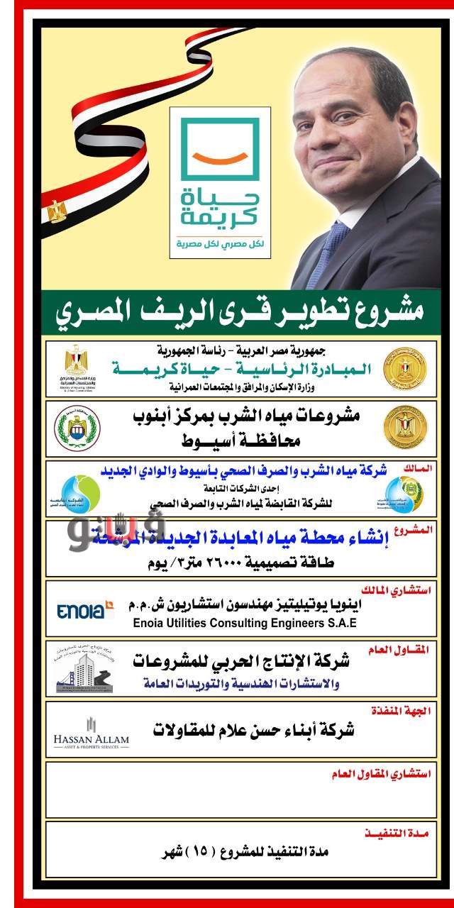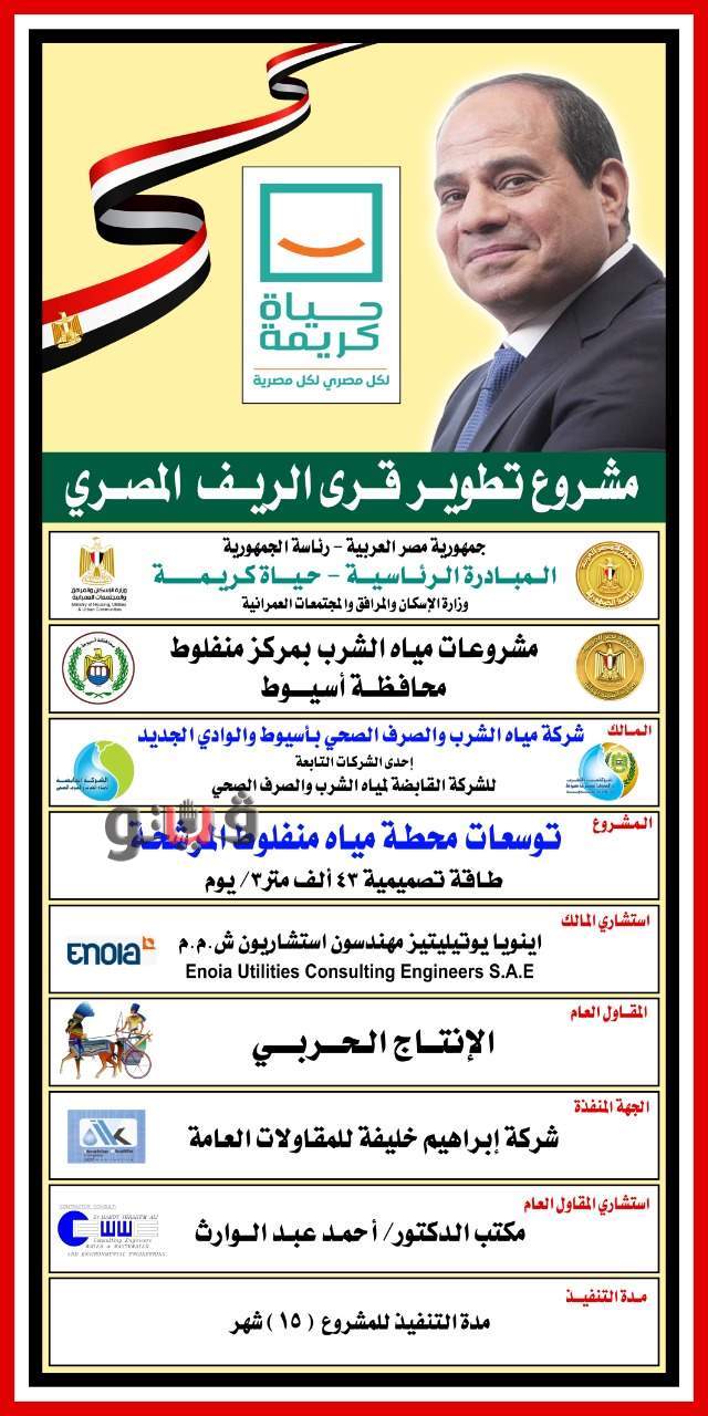 وقعت شركة مياه الشرب والصرف الصحي بمحافظة أسيوط والوادى الجديد عقد اتفاق مع شركة الإنتاج الحربى للمشروعات والاستشارات الهندسية والتوريدات لتنفيذ مشروعات المياه، وذلك فى إطار الأعمال التنفيذية لمبادرة حياة كريمة الرئاسية والتى تستهدف تطوير قرى الريف المصرى وتحقيق الحراك الاقتصادي للقرى الأكثر فقراً فى ضوء خطة متوسطة المدى أقرتها السلطات التنفيذية والقيادات السياسية التى وضعت نصب عينيها توفير سبل العيش الكريم لكل المصريين على مستوى الجمهورية.