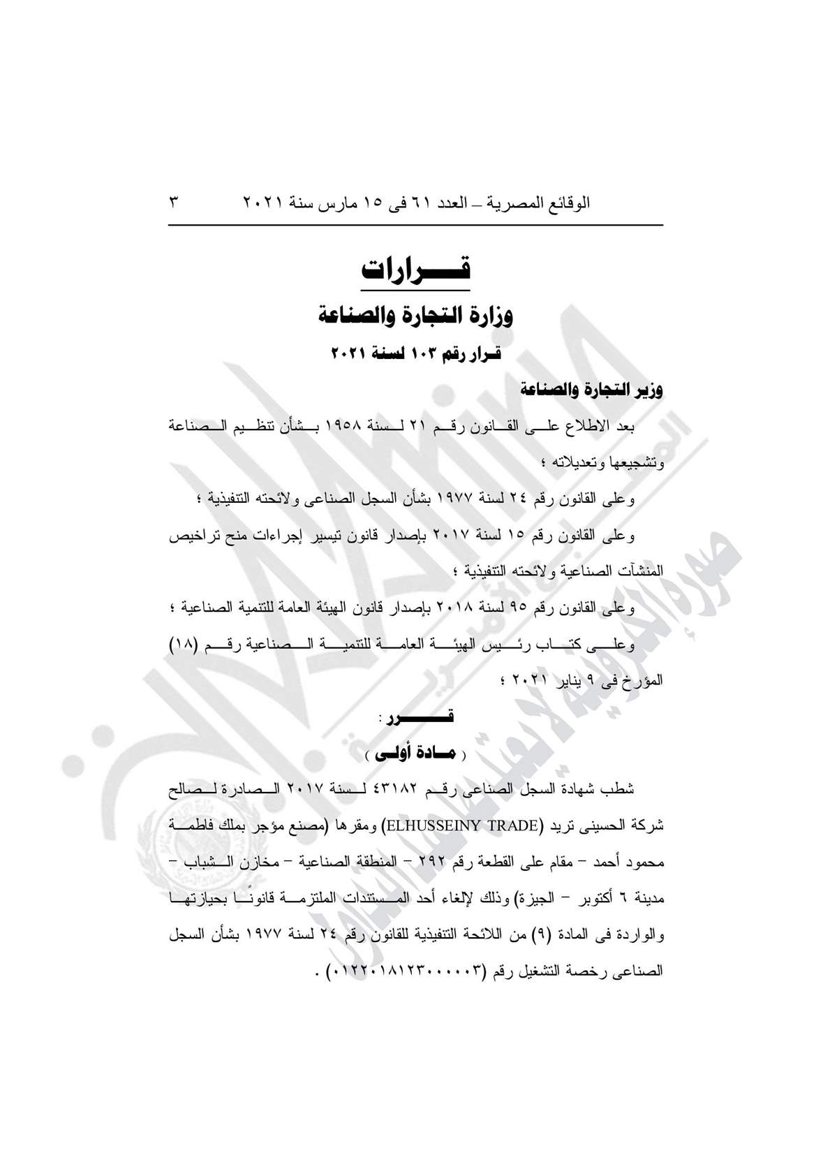 نشرت جريدة الوقائع المصرية في عددها رقم 61، الصادر في 15 مارس 2021، قرار وزارة التجارة والصناعة رقم 103 لسنة 2021، بشأن شطب شهادة السجل الصناعي الصادرة لصالح شركة الحسيني تريد، وذلك لإلغاء أحد المستندات الملتزمة قانونًا بحيازنها.