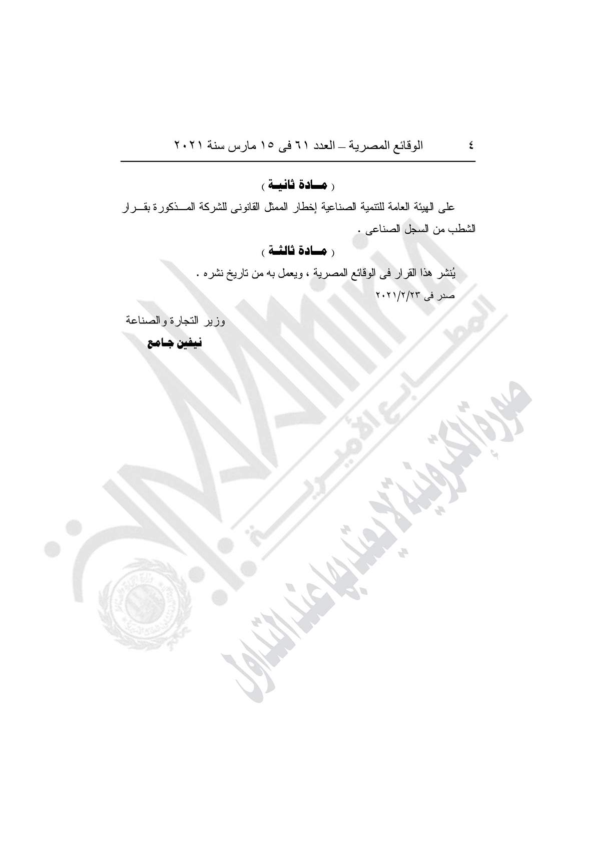 وجاء في المادة الثانية "على الهيئة العامة للتنمية الصناعية إخطار الممثل القانوني للشركة بقرار الشطب من السجل الصناعي".