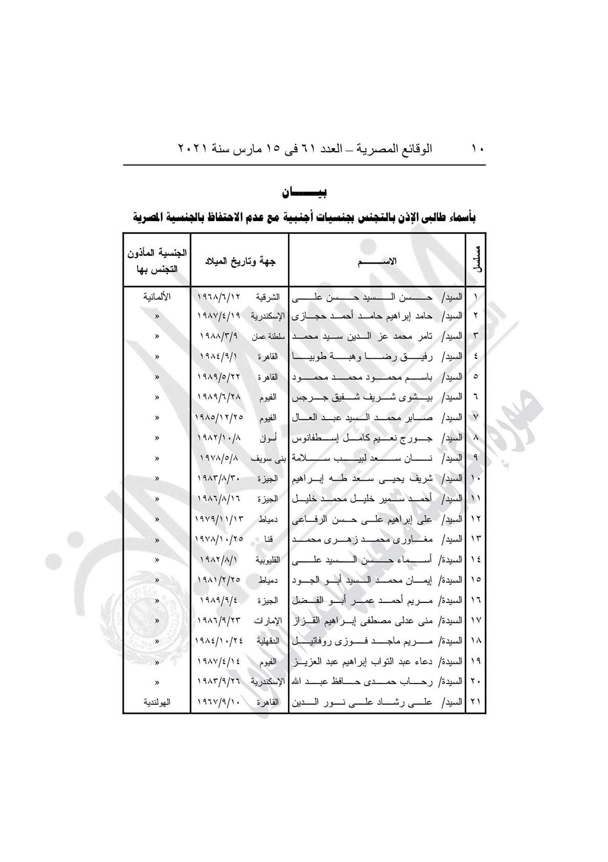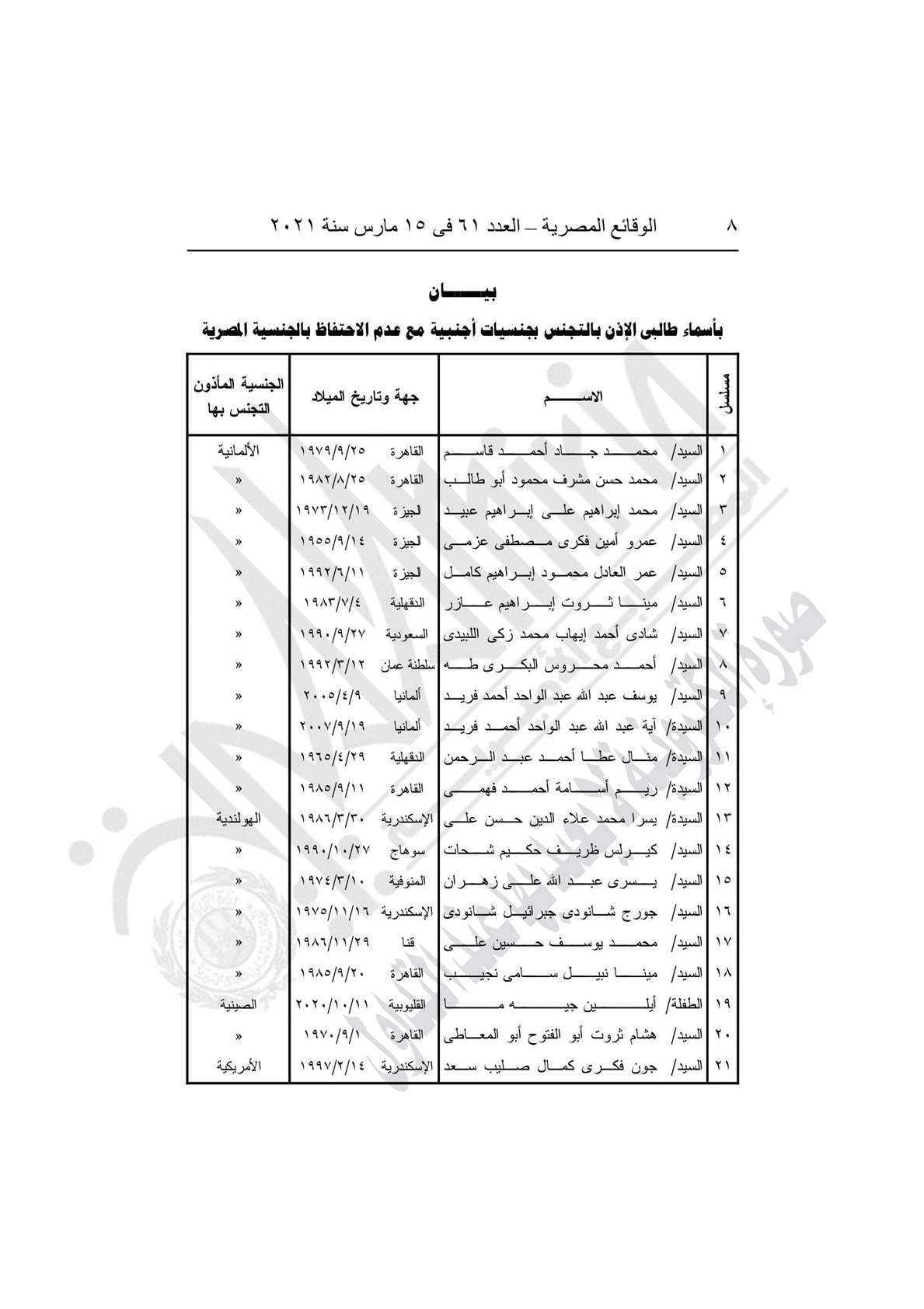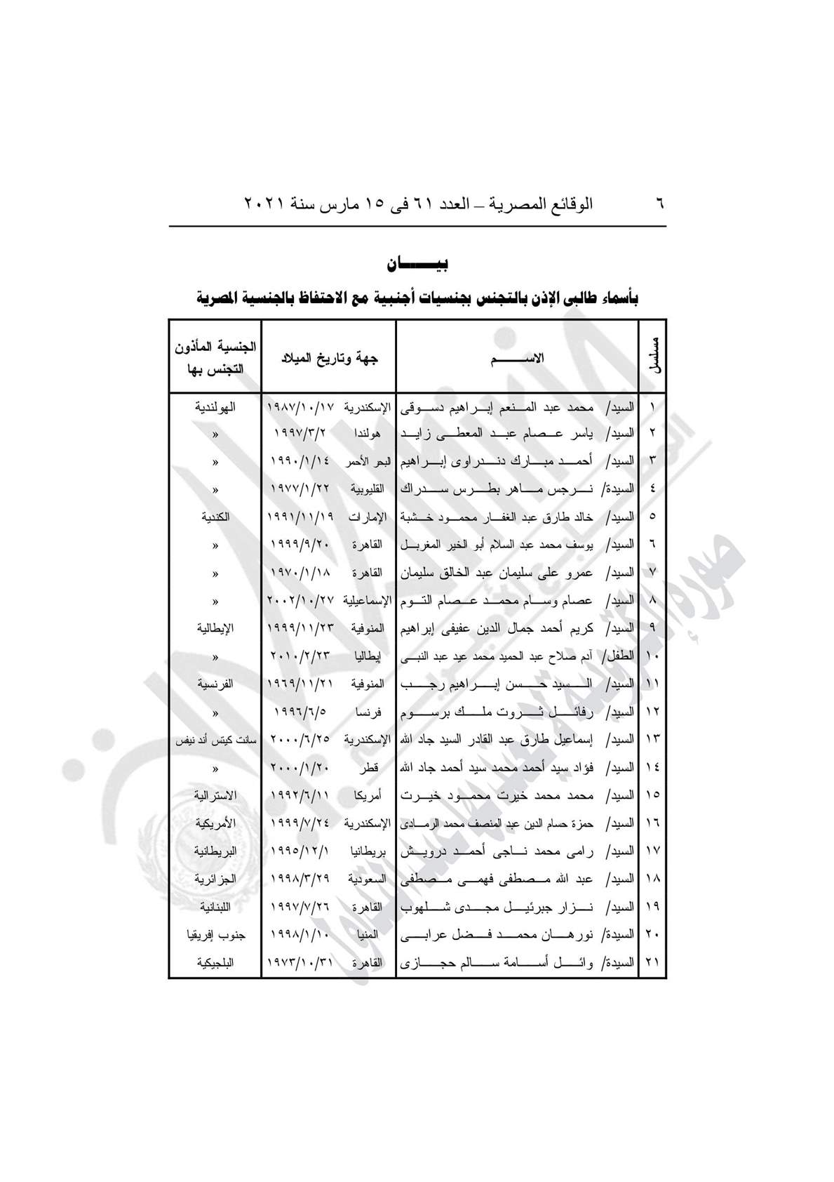 نشرت جريدة الوقائع المصرية في عددها رقم 61، الصادر في 15 مارس 2021، 4 قرارات لوزارة الداخلية بسحب الجنسية المصرية من 42 مواطنًا، والإذن لـ 42 آخرين التجنس بالجنسية الأجنبية واحتفاظهم بالجنسية المصرية.