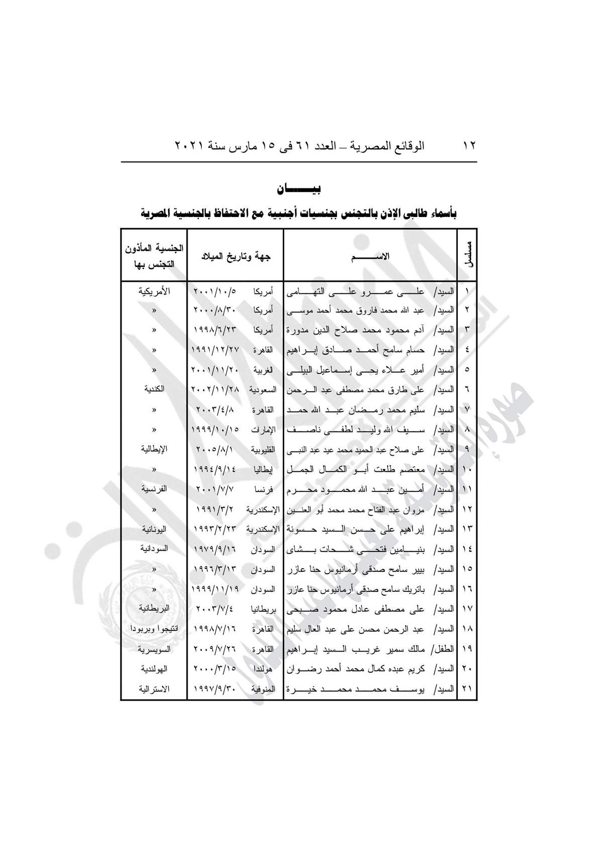 القرار رقم 217 لسنة 2021، بالإذن لكل من الواحد والعشرين مواطنًا (أولهم محمد عبد المنعم إبراهيم دسوقي وآخرهم وائل أسامة سالم حجازي) المدرجة أسماؤهم بالبيان بالتجنس بالجنسية الأجنبية قرين اسم كل منهم، مع احتفاظهم بالجنسية المصرية.