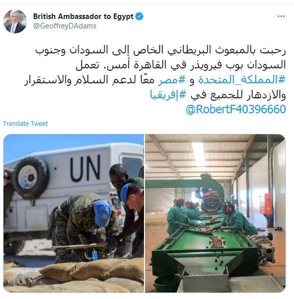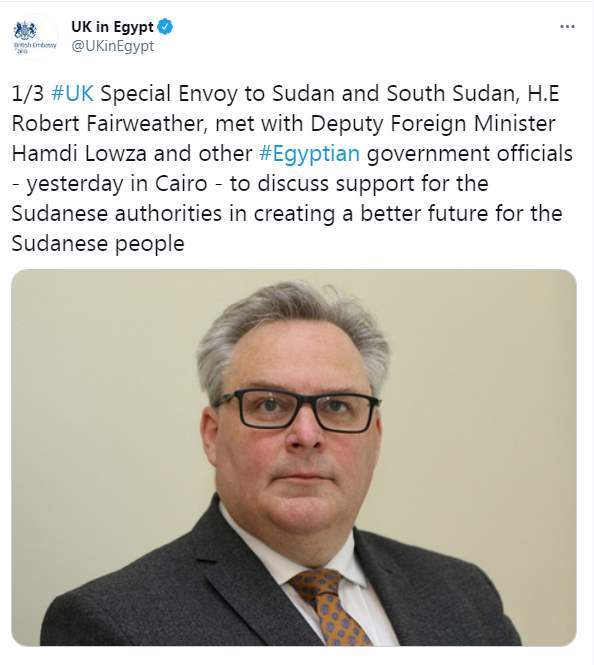 وكتبت السفارة البريطانية بالقاهرة تغريدة على تويتر "المبعوث البريطاني للسوادان وشمال إفريقيا روبرت تقابل مع السفير حمدى سند لوزا، نائب وزير الخارجية للشئون الإفريقية ومسئولين بالحكومة المصرية أمس في القاهرة، لمناقشة دعم السلطات السودانية لخلق مستقبل أفضل للشعب السودان"