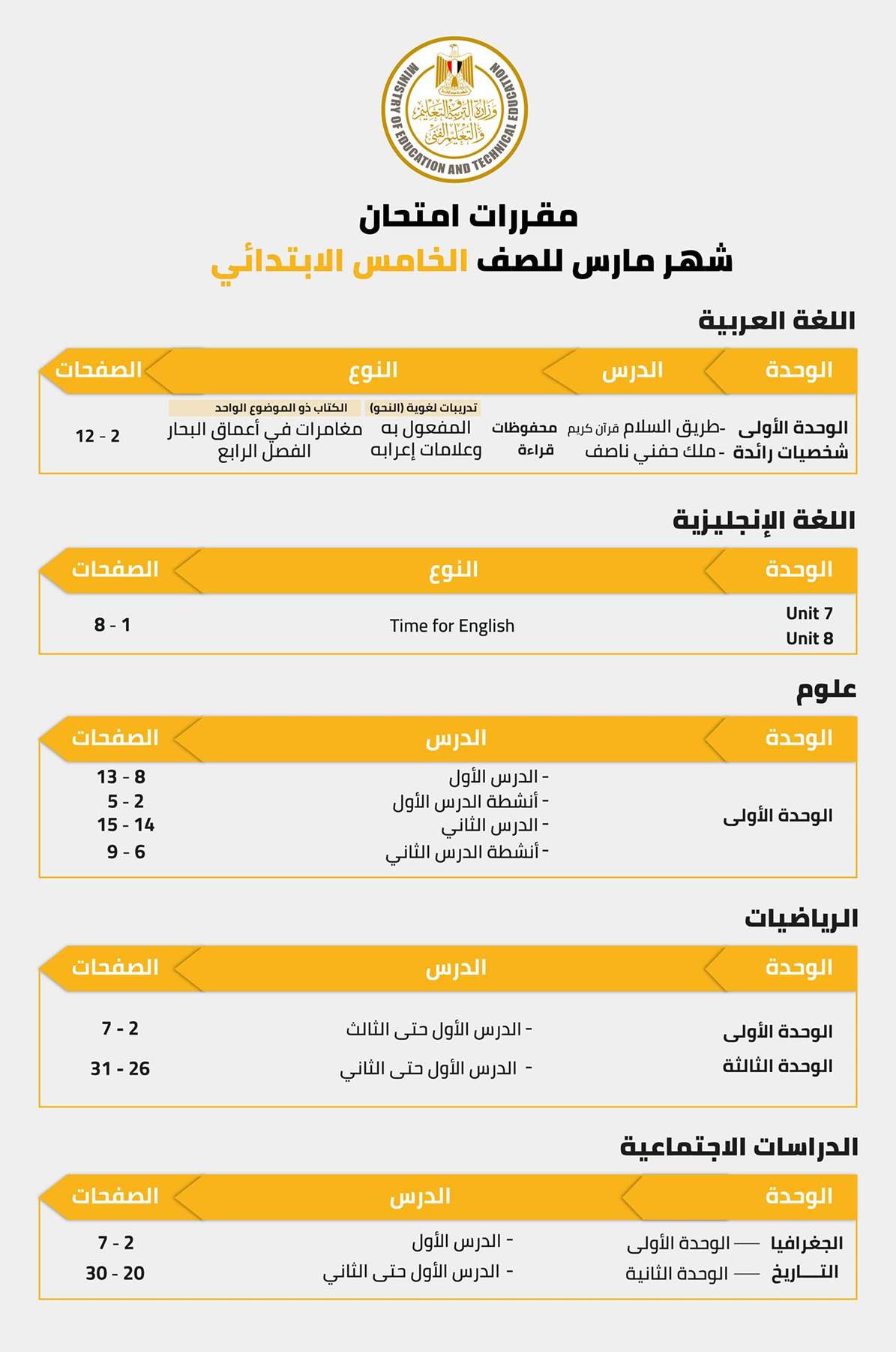 ونشرت وزارة التربية والتعليم والتعليم الفني عن مقررات شهر مارس لطلاب الصف الخامس الابتدائي للامتحان المتعدد التخصصات الذي من المقرر أن يؤديه الطلاب خلال شهر مارس في جميع المواد الأساسية (العلوم، الدراسات الاجتماعية، اللغة العربية، الإنجليزية، الرياضيات).