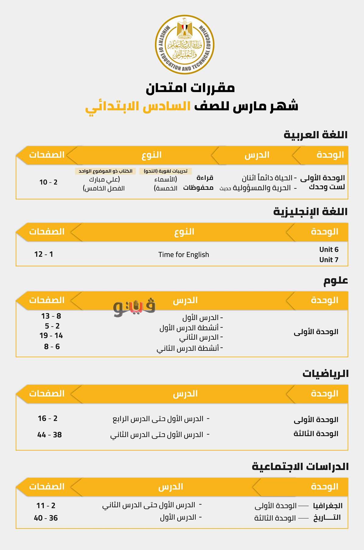 مقررات امتحان شهر مارس لطلاب الصف السادس الابتدائي