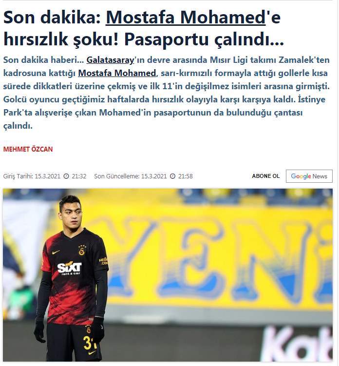 وكانت صحيفة "sabah" التركية، ذكرت أن مصطفى محمد لاعب جالاتا سراي التركي تعرض لحادث مؤسف بعد سرقة حقيبته؛ أثناء توجهه للتسوق في إستيني بارك.