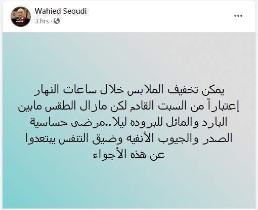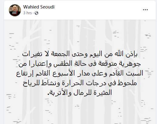 وكتب وحيد سعودي تدوينة على فيس بوك قال فيها: "بإذن الله من اليوم وحتى الجمعة لا تغيرات جوهرية متوقعة في حالة الطقس واعتبارا من السبت القادم وعلى مدار الأسبوع القادم ارتفاع ملحوظ في درجات الحرارة ونشاط للرياح المثيرة للرمال والأتربة".