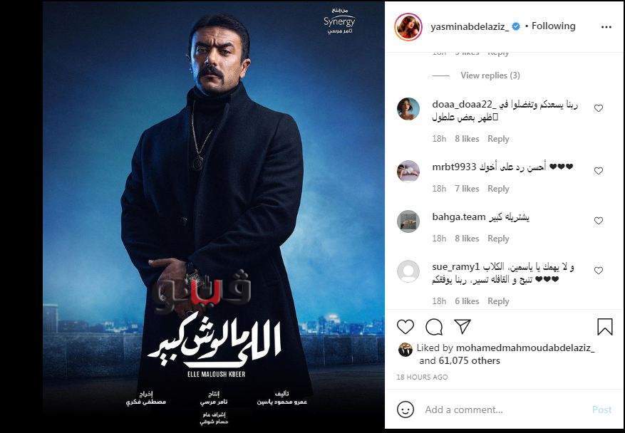 وكي تتفادي الفنانة ياسمين عبدالعزيز الأزمة قامت بنشر بوستر مسلسلها اللي ملوش كبير والذى يظهر فيه أحمد العوضي منفردًا عبر حسابها الخاص على موقع التواصل الاجتماعي انستجرام".