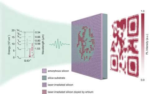 وأنشأ الباحثون صورا فريدة على ملصق غشاء مصغر (نانوفيلم)، مصنوع من السيلكون لتصنيف البضائع، وصمم الباحثون الغشاء المصغر، على شكل مصفوفة ثقوب غير مرئية للعين المجردة، إذ تحتوي بعض هذه الثقوب على أيونات معدن ”إربيوم“، بينما لا تحتوي باقي الثقوب على هذا المعدن، ويتغير لون الثقوب المملوءة بمعدن ”إربيوم“ تحت تأثير إشعاع الليزر؛ ما أتاح للباحثين قراءة صورة تصنيف العلامة التجارية بشكل صحيح.