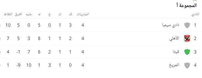 ونجح الاهلي في احتلال المركز الثاني في جدول ترتيب المجموعة الأولى برصيد 7 نقاط بينما يتربع سيمبا علي الصدارة برصيد 10 نقاط بعد فوزه علي المريخ.
