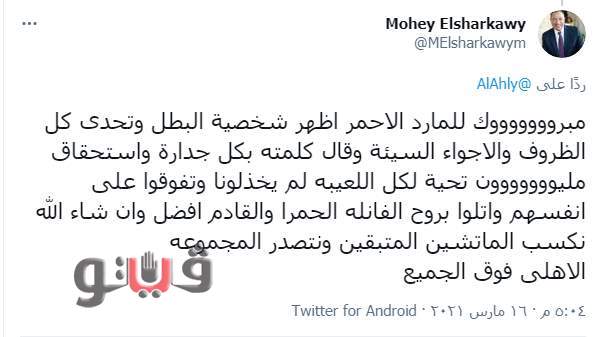 وتابع محيى الشرقاوي: «مبروك للمارد الأحمر أظهر شخصية البطل وتحدى كل الظروف والأجواء السيئة، وقال كلمته بكل جدارة واستحقاق».