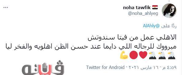 وكتب نها توفيق: "الاهلي عمل من فيتا ساندوتش.. مبرووك للرجاله اللي دايما عند حسن الظن أهلاوية والفخر ليا".
