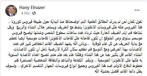 وكتب هاني الناظر تدوينة على الفيس بوك "نقول كمان لمن لم يدرك الحقائق العلمية التي أوضحناها منذ البداية حول طبيعة فيروس كورونا.. هذا الفيروس مثله مثل فيروسات الانفلونزا ينشط مع الخريف ويستمر خلال الشتاء والربيع ويقل نشاطه في أيام الصيف الحارة حيث تزداد عدد ساعات سطوع الشمس وشدتها ليصبح فيروس موسمي سنوي"