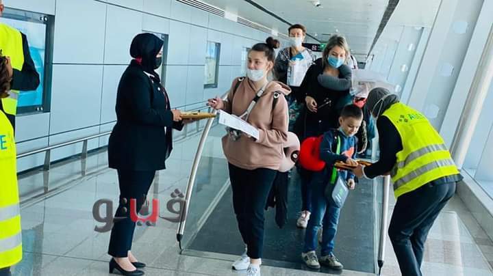 ووزعت إدارة العلاقات العامة بالمطار الشيكولاته والورود على طاقم الطائرة والركاب وتسهيل كافة الإجراءات مع الالتزام بالضوابط الاحترازية المتبعة في كافة المطارات المصرية .