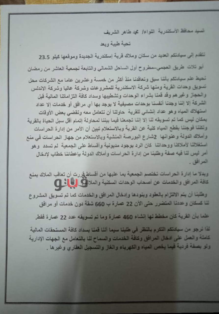 و وأوضح خالد، تقدمنا يطلب الي جهاز الحراسات وأملاك الدولة ومحافظ الإسكندرية للننهي معاناه ٦٦٠ أسرة تسلمت وحداتها، ونأمل أن يستجيب لنا المسئولين حتي لا تضيع أموالنا خاصة أن كثيرين هم ورثة في المشروع بعد أن مات ذويهم.