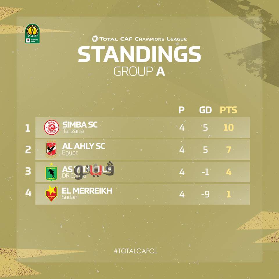 وفي المجموعة الأولى يتصدر سيمبا التنزاني الترتيب برصيد 10 نقاط وخلفه النادي الأهلي 7 نقاط ويحل فيتا كلوب ثالثا برصيد 4 نقاط بينما يتزيل فريق المريخ الترتيب بنقطة واحدة.