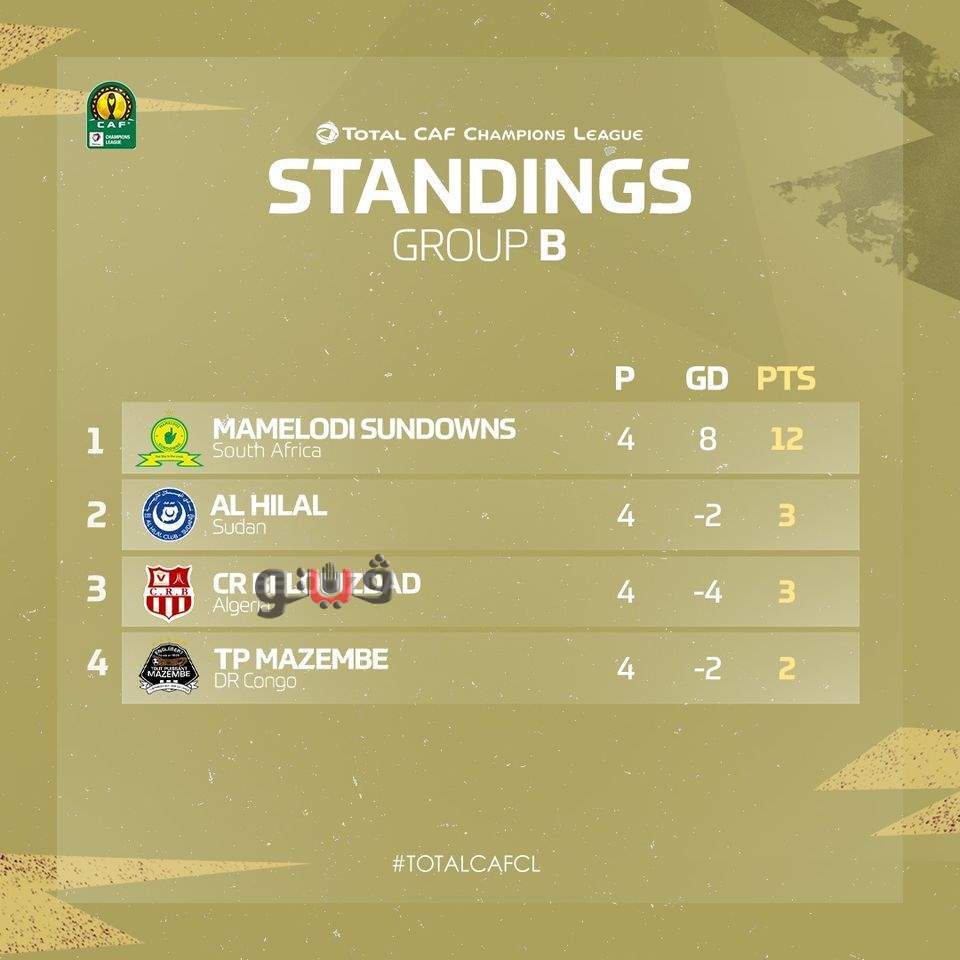 في المجموعة الثاني حجز فريق صن داونز بطاقة التأهل بعد أن رفع رصيده إلى 12 نقطة بينما يمتلك كل من الهلال السوداني وشباب بلوزداد 3 نقاط ومازيمبي الكونغولي نقطتين.