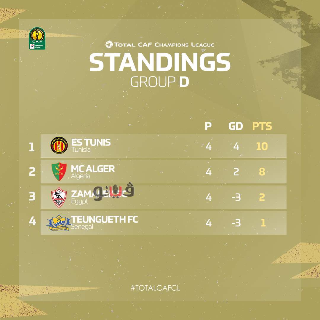 تأهل الترجي التونسي لدور ربع النهائي بتصدره المجموعة الرابعة برصيد 10 نقاط ويأتي خلفه مولودية الجزائر برصيد 8 نقاط بينما الزمالك في المركز الثالث برصيد نقطتين وفريق تونجيث السنغالي رابعا بنقطة واحدة.