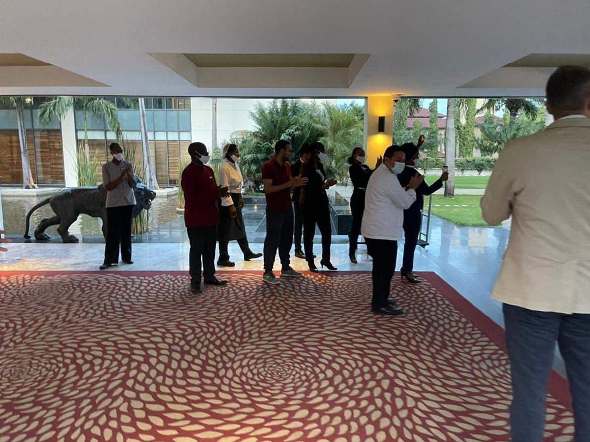 نظم العاملون بفندق الإقامة استقبالا مميزا للاعبي فريق نادي بيراميدز بعد عودتهم من ملعب تنزانيا الوطني بالعاصمة دار السلام، عقب الفوز على نامونجو التنزاني.