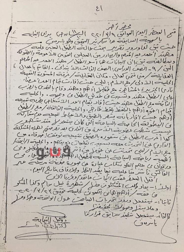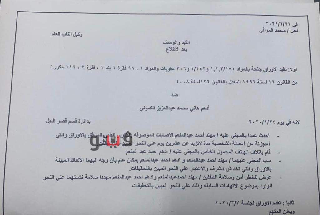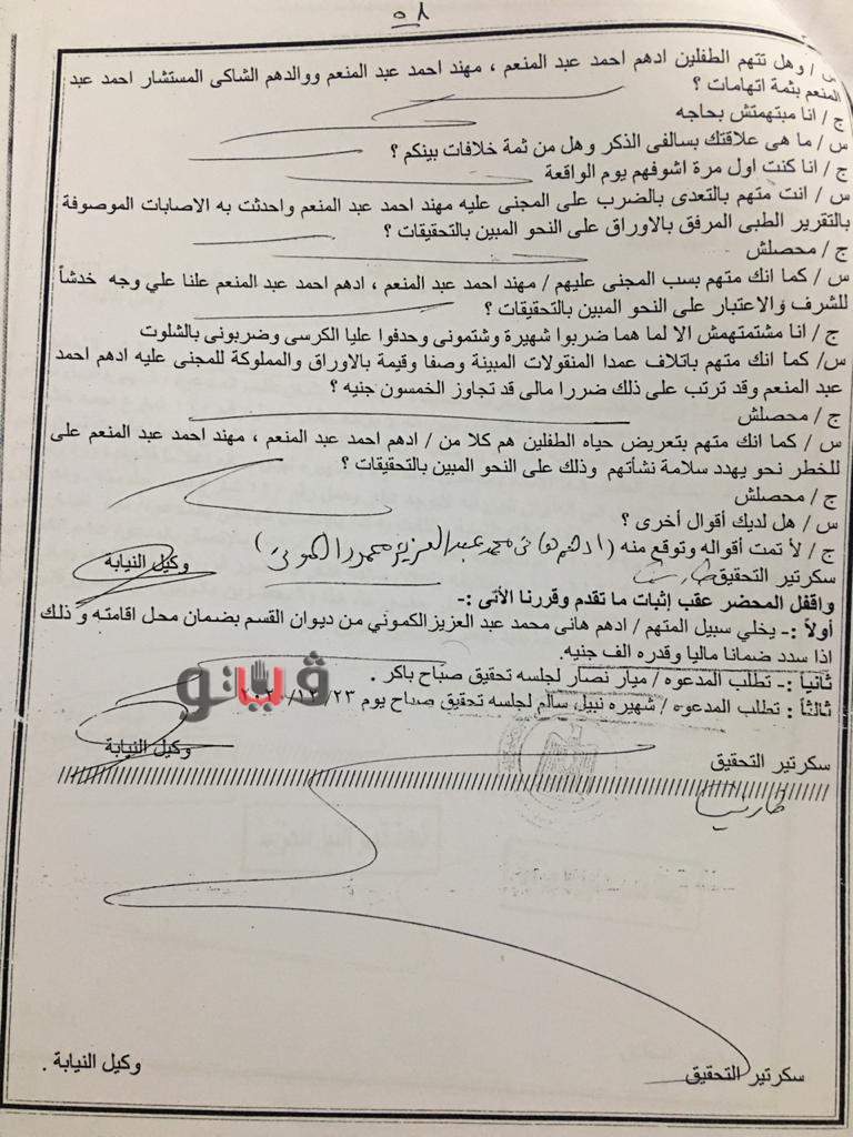 وكانت النيابة أخلت سبيل المتهم بكفالة 1000 جنيه بعد أن استمعت الى أقوال الطفلين المعتدى عليهما واللذين أفادا بقيام المتهم بالاعتداء على الطفل الصغير (م ـ أ ـ ع) 8 سنوات بالضرب وخنقه وترويعه والاعتداء عليه بالسب مما تسبب له فى احداث اصابة فى الوجه، كما قام بإتلاف هاتف شقيقه (أ ـ أ ـ ع) 11 سنة عند محاولة تصويره، وقام بالاعتداء عليهما مجتمعين بالسب بألفاظ خادشة للحياء العام.
