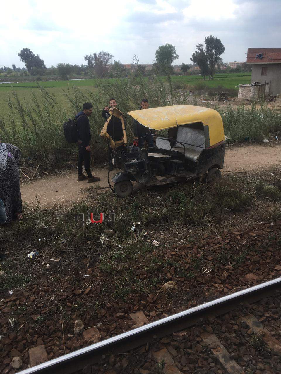 تركه صاحبه وهرب.. قطار طنطا يصدم توك توك بمحطة الراهبين| صور