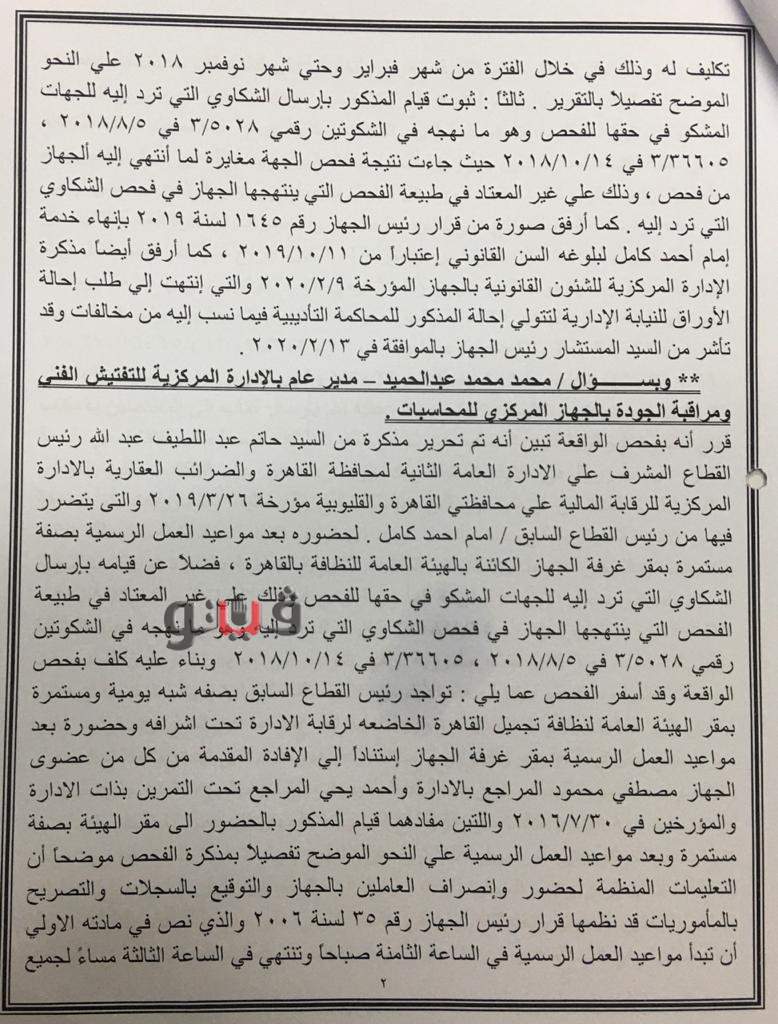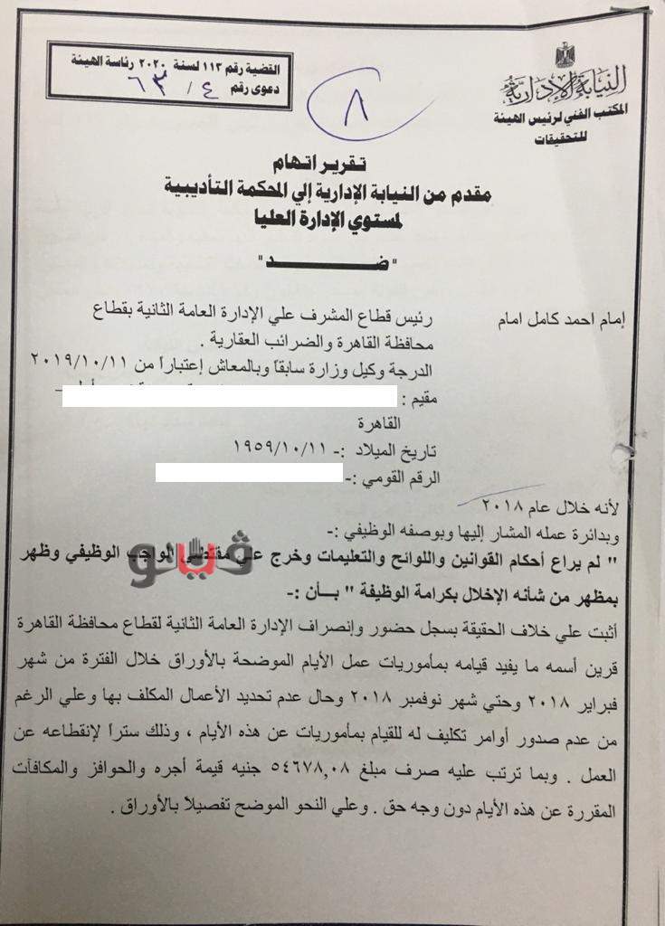 كشفت التحقيقات أن إمام أ. ك.، رئيس قطاع محافظة القاهرة والضرائب العقارية بالجهاز المركزي للمحاسبات بدرجة "وكيل وزارة" لم يراع أحكام القوانين واللوائح والتعليمات خارجًا على مقتضى الواجب الوظيفي وظهر بمظهر من شأنه الإخلال بكرامة الوظيفة العامة