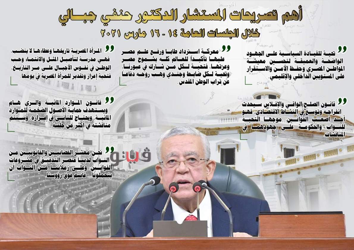 شهدت جلسات البرلمان الثلاثة على مدار الأسبوع عددا من التصريحات العامة للمستشار حنفي جبالي، رئيس المجلس، تضمنت العديد من الملفات.