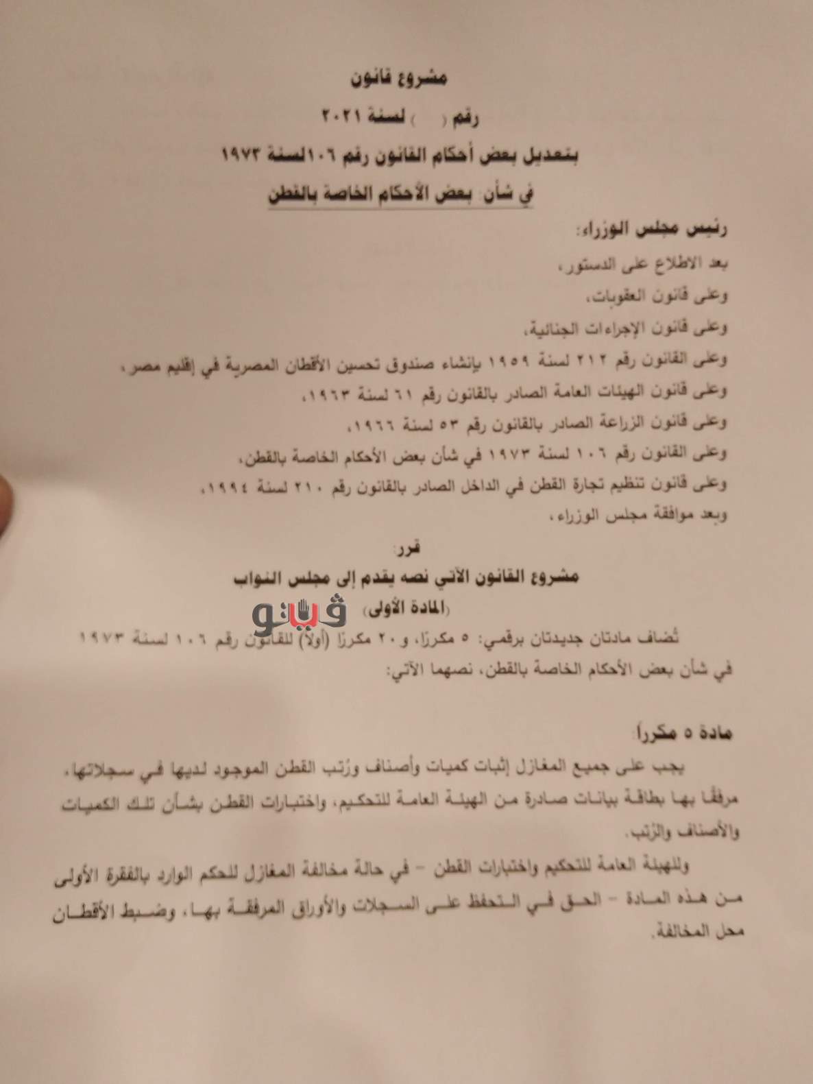 مشروع قانون بتعديل بعض أحكام القانون رقم 106 لسنة 1973 في شأن بعض الأحكام الخاصة بالقطن.