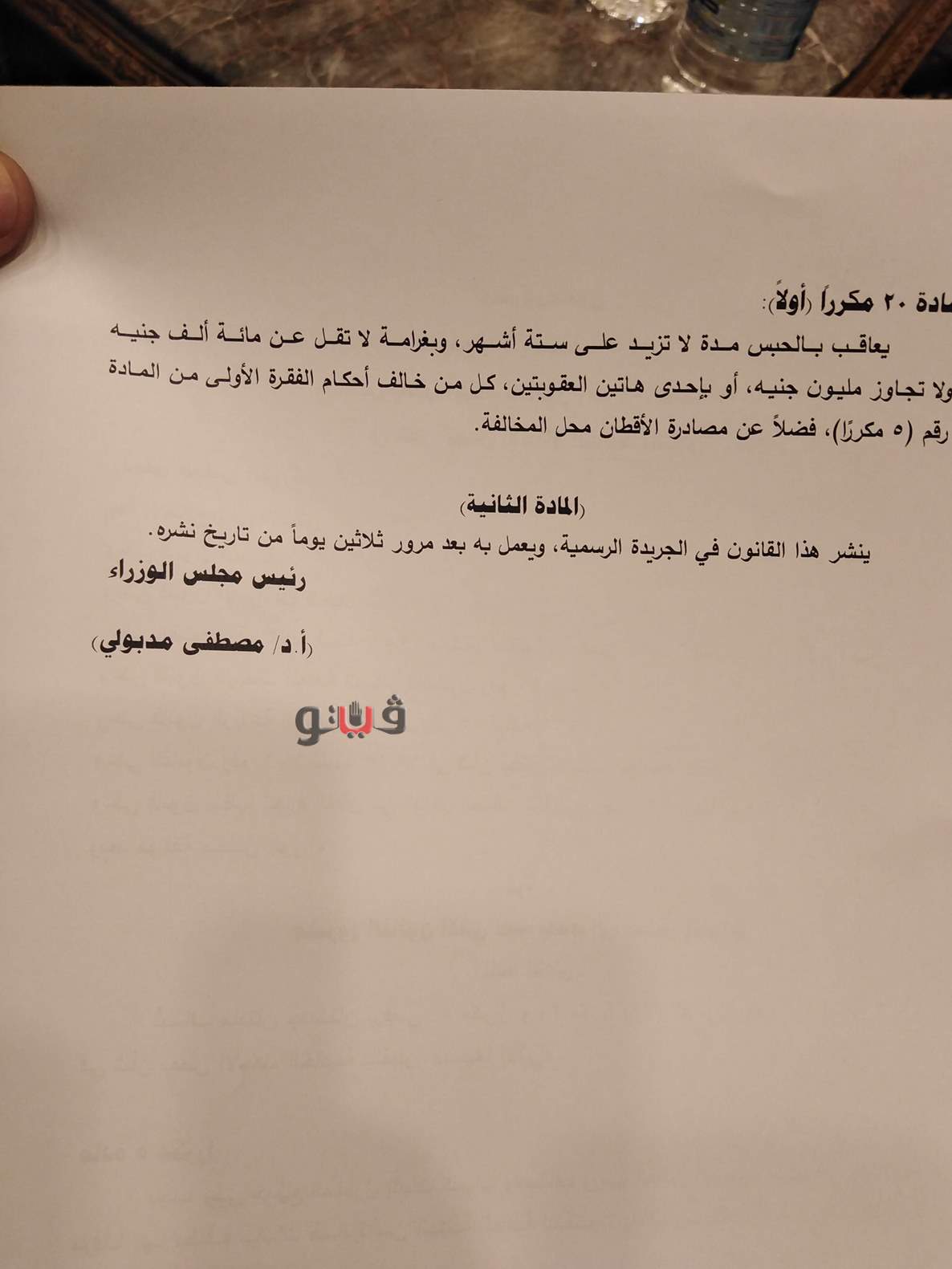 يعاقب بالحبس مدة لا تزيد عن ستة أشهر، وبغرامة لا تقل عن مائة ألف جنيه ولا تجاوز مليون جنيه، أو بإحدى هاتين العقوبتين، كل من خالف أحكام الفقرة الأولى من المادة رقم 5 مكرر، فضلا عن مصادرة الأقطان محل المخالفة.