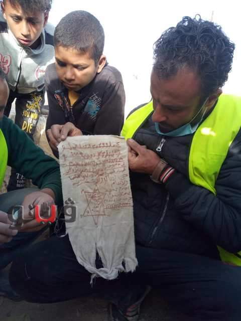 ويتكون الفريق الشبابي من 5 متطوعين، هم: أحمد عبد التواب هاشم وعمرو سعد الصياد وطارق المصري ومصطفى جمال، بالإضافة لشباب القرية ، واستمرت مهمتهم لـ3 ساعات متواصلة، عثروا خلالها على أعمال سحر متنوعة، منها ورق كراسات مدرسية، مدون عليها عبارات بعضها مكتوب برموز وطلاسم غير مفهومة، وبعضها مكتوب باللغة العربية، وعلى قفل حديدي، وأخرى على قطع من القماش.
