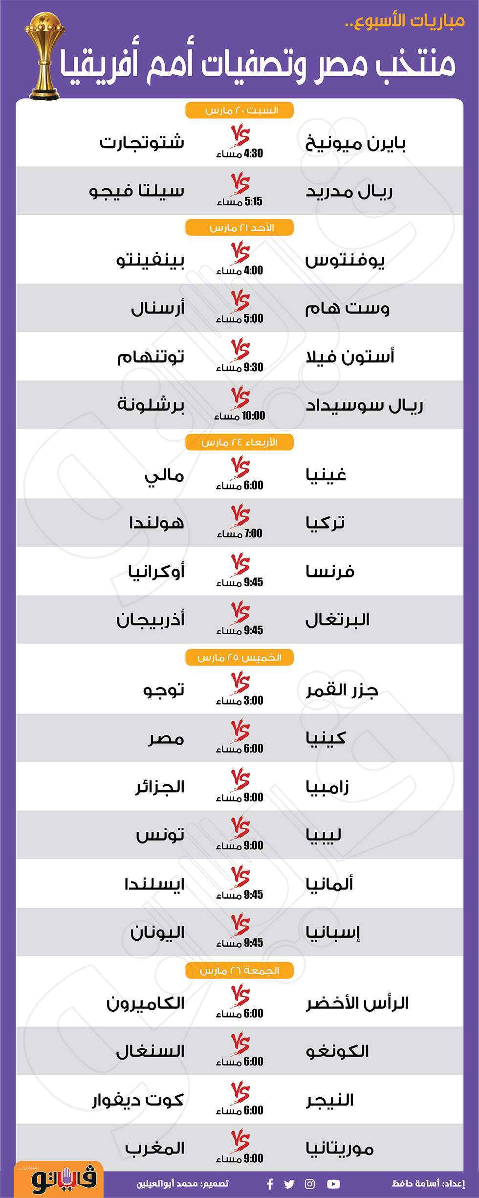 مباريات الأسبوع.. عودة منتخب مصر وتصفيات أمم أفريقيا الجمعة 19/مارس/2021 - 07:58 م 3/19/2021 7:58:32 PM المنتخب أسامة حافظ شارك طباعة 18 حجم الخط شارك طباعة منتخب مصر تصفيات كأس الأمم الأفريقية مواعيد مباريات الأسبوع