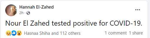 أعلنت الفنانة هنا الزاهد عن إصابة شقيقتها نور بفيروس كورونا كوفيد 19، وإيجابية المسحة الخاصة به، وكانت هنا قد أعلنت إصابتها منذ يوم بفيروس كورونا.