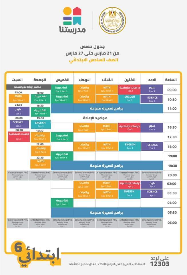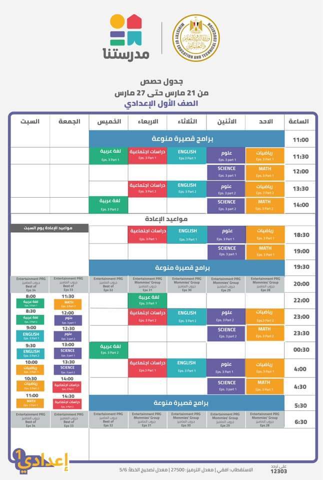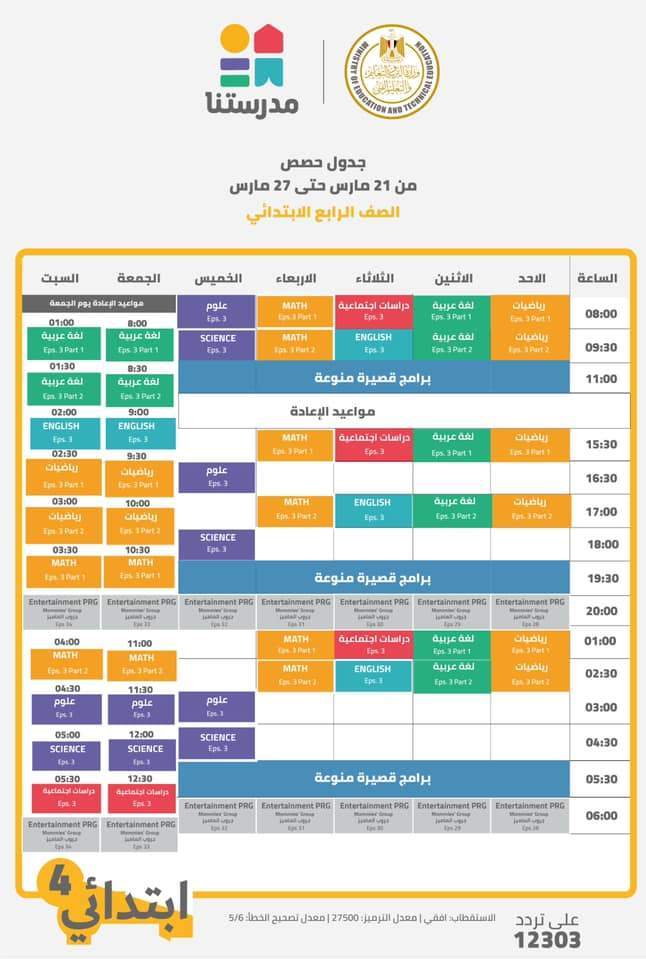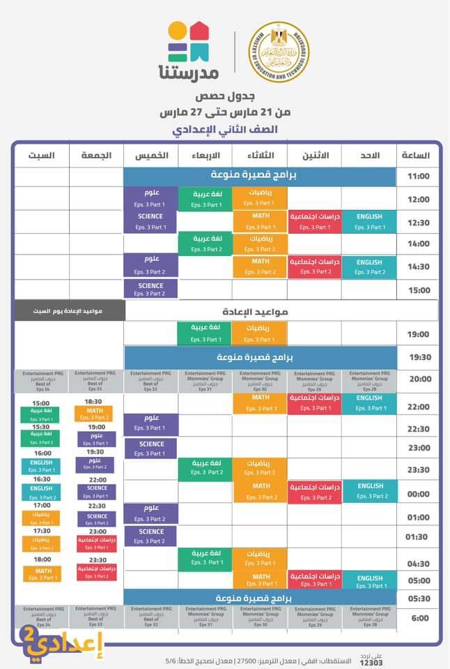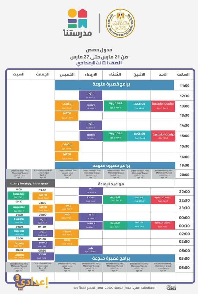 أعلنت وزارة التربية والتعليم والتعليم الفني، جداول الأسبوع الثالث والعشرين للطلاب من الصف الرابع الابتدائي حتى الثالث الإعدادي، في الفترة من يوم الأحد ٢١ مارس حتى السبت ٢٧ مارس ٢٠٢١.