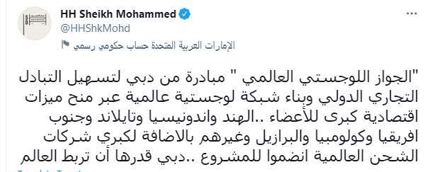 وكتب الشيخ محمد بن راشد آل مكتوم تغريدة على تويتر "الجواز اللوجستي العالمي" مبادرة من دبي لتسهيل التبادل التجاري الدولي وبناء شبكة لوجستية عالمية عبر منح ميزات اقتصادية كبرى للأعضاء ..الهند وإندونيسيا وتايلاند وجنوب افريقيا وكولومبيا والبرازيل وغيرهم بالاضافة لكبري شركات الشحن العالمية انضموا للمشروع ، دبي قدرها أن تربط العالم".