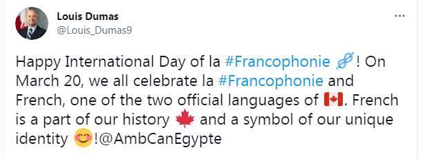 وكتب سفير كندا بالقاهرة: "يوم دولي سعيد للفرانكفونية، في الـ 20 من مارس، نحتفل بالفرانكفونية والفرنسية، واحدة من اللغتين الرسميتين لكندا.. الفرنسية جزءًا من تاريخنا؛ ورمزًا لهويتنا المتفردة".