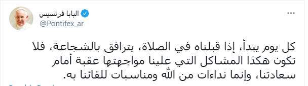 وكتب بابا الفاتيكان البابا فرنسيس تغريدة على تويتر: "كل يوم يبدأ، إذا قبلناه في الصلاة، يترافق بالشجاعة، فلا تكون هكذا المشاكل التي علينا مواجهتها عقبة أمام سعادتنا، وإنما نداءات من الله ومناسبات للقائنا به"ش