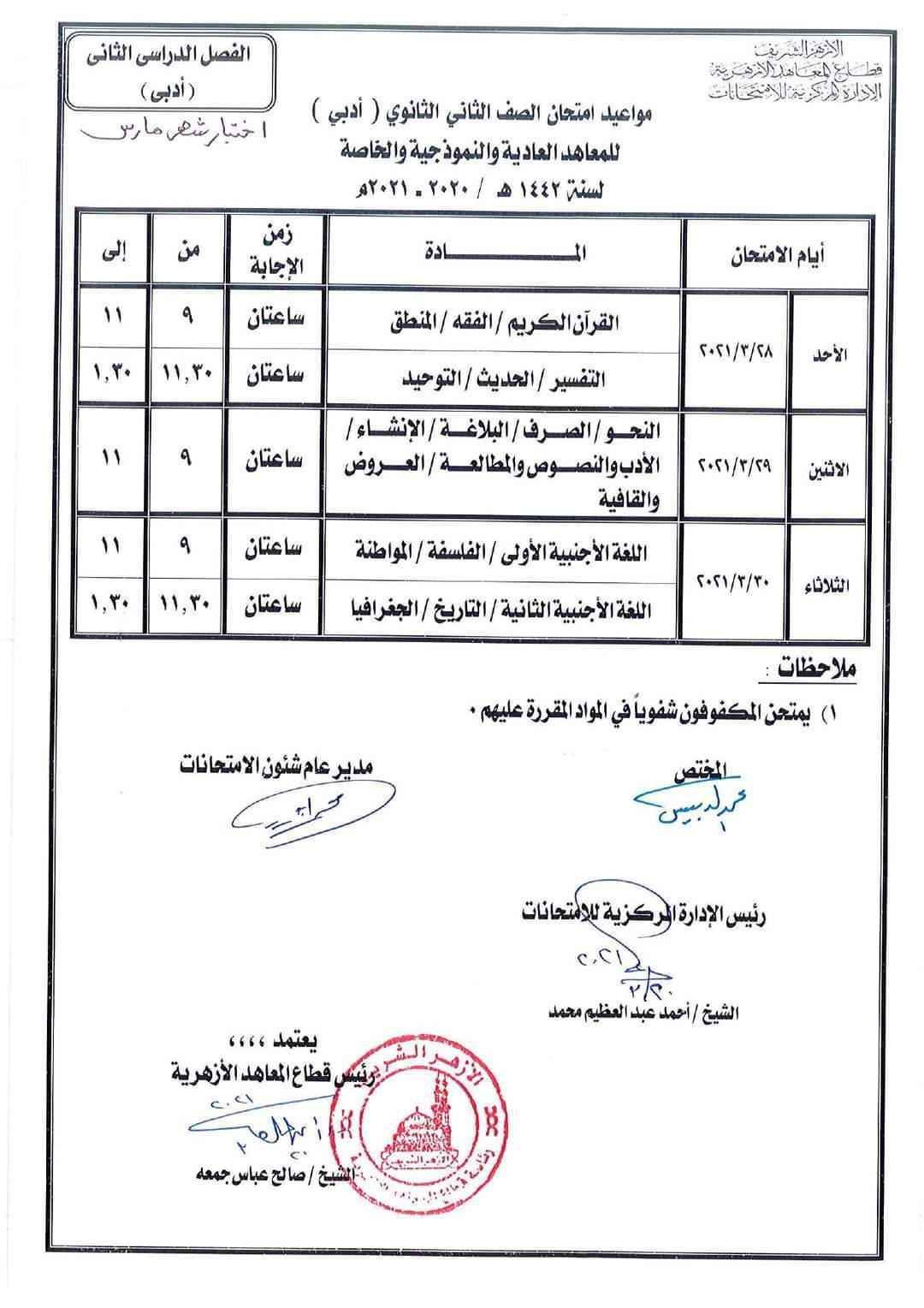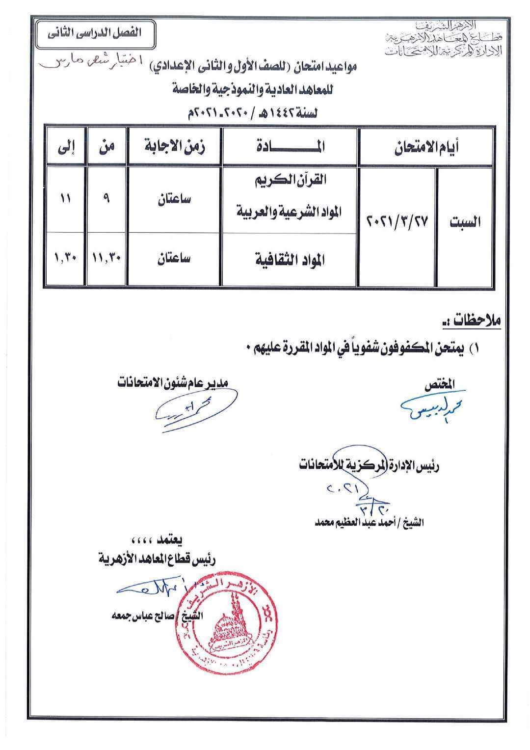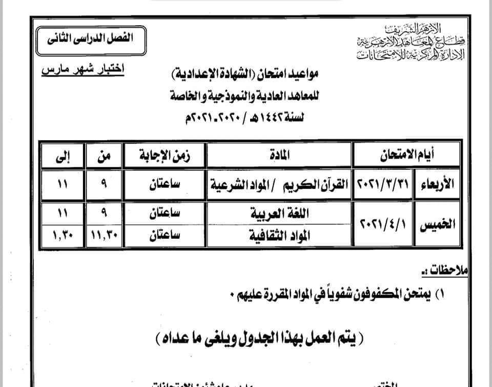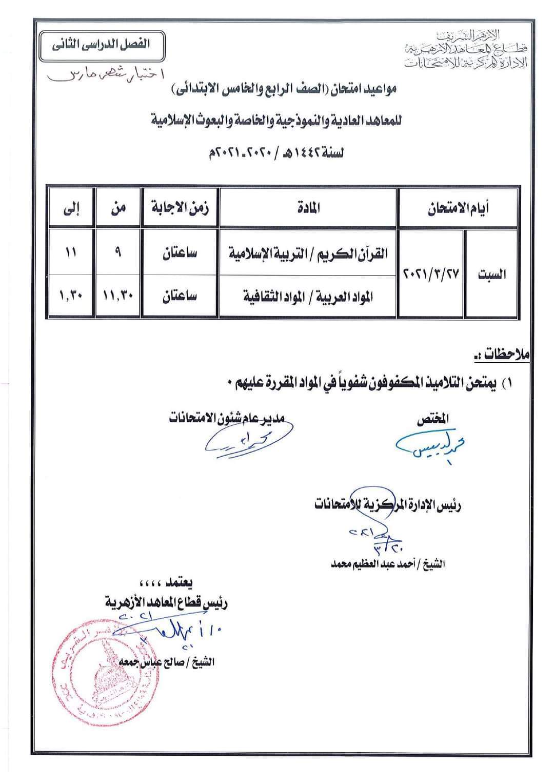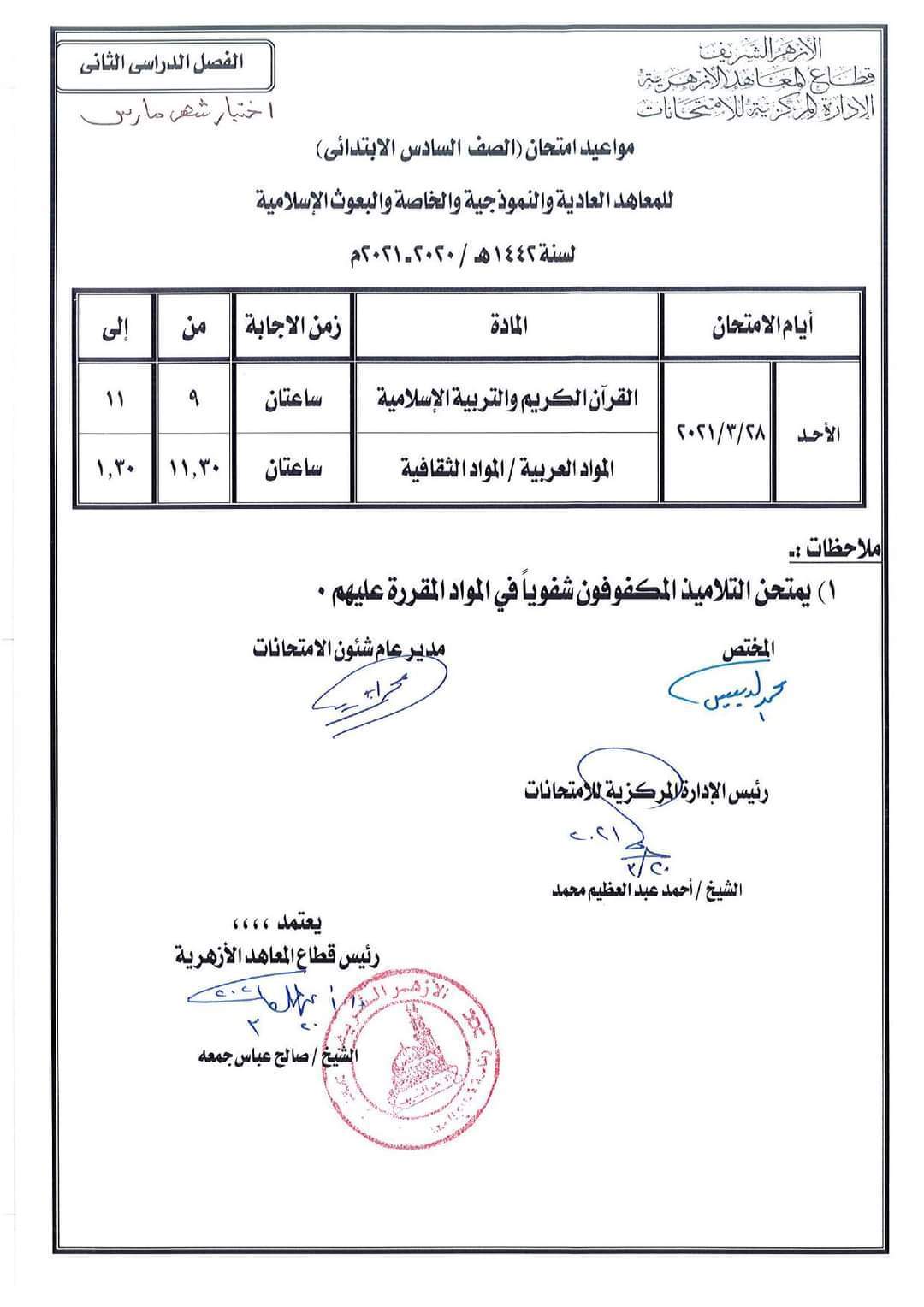 وأصدر قطاع المعاهد الأزهرية، تعليمات لمديري الإدارات التعليمية الأزهرية بالتنبيه على شيوخ المعاهد بجميع المراحل التعليمية (الابتدائي الإعدادي الثانوي)، اختيار أكفأ المعلمين في كل تخصص لتحضير وتجهيز أسئلة شهر مارس 2021 ، من ذات المنهج الجديد على غرار ورقة امتحان الفصل الدراسي الأول حسب كل صف دراسي.