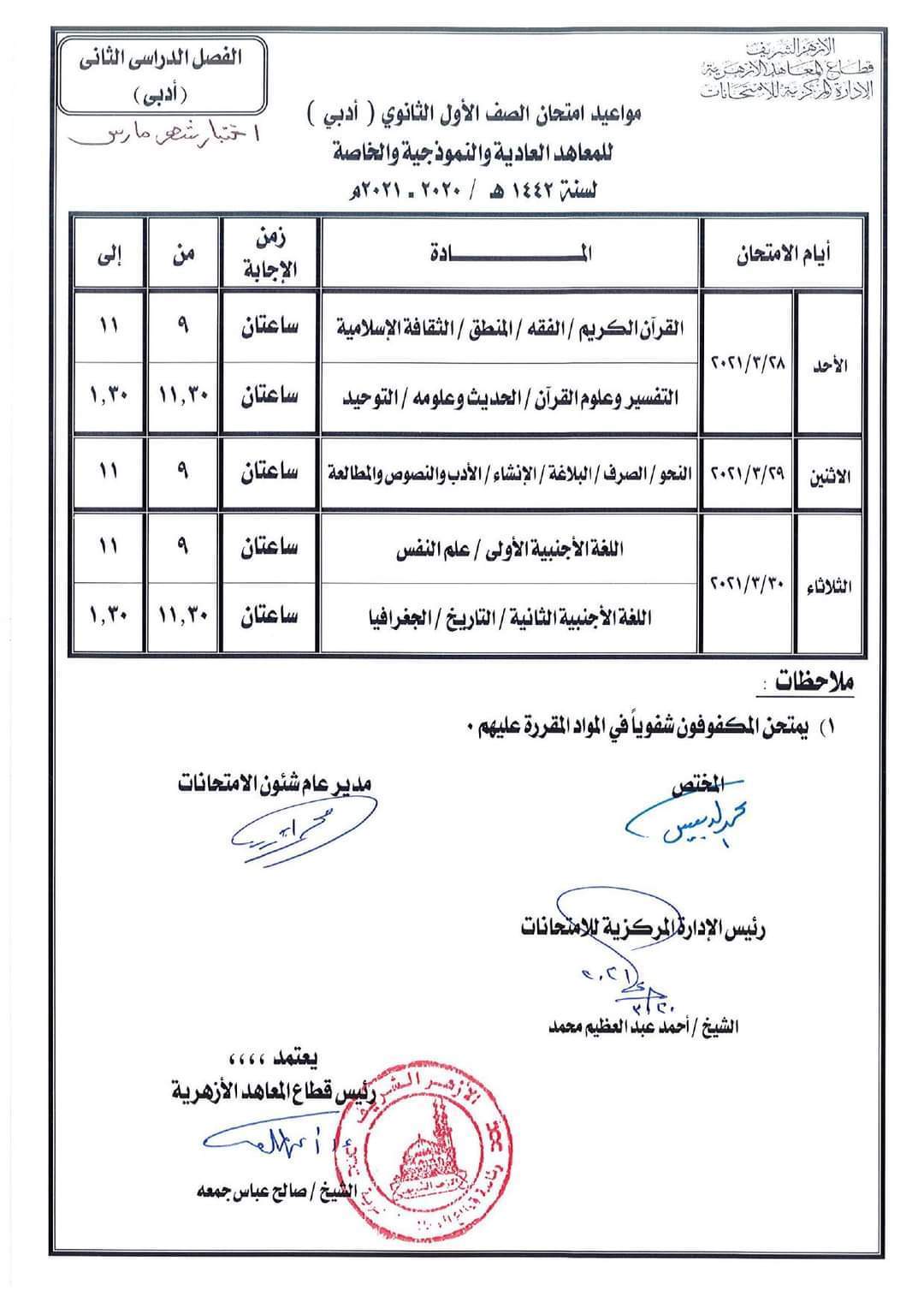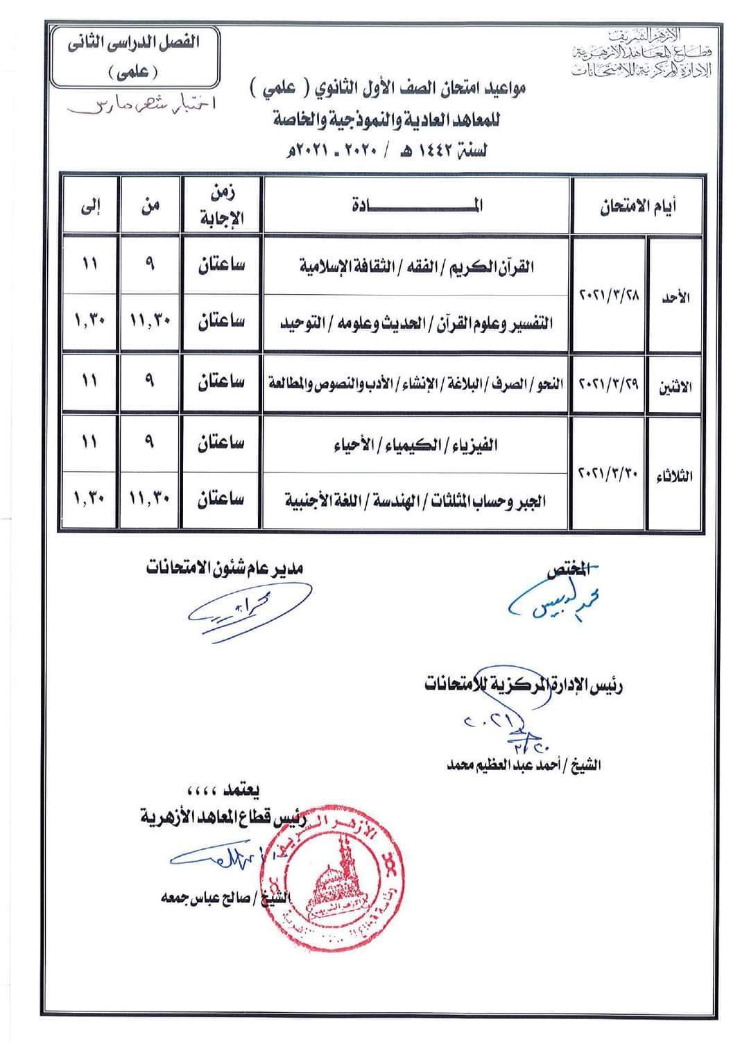 أعلن قطاع المعاهد الأزهرية، اليوم السبت، جدول امتحانات شهر مارس للعام الدراسي 2020-2021، والتي تنطلق بدءا من 27 مارس وحتى 31 مارس الجاري.