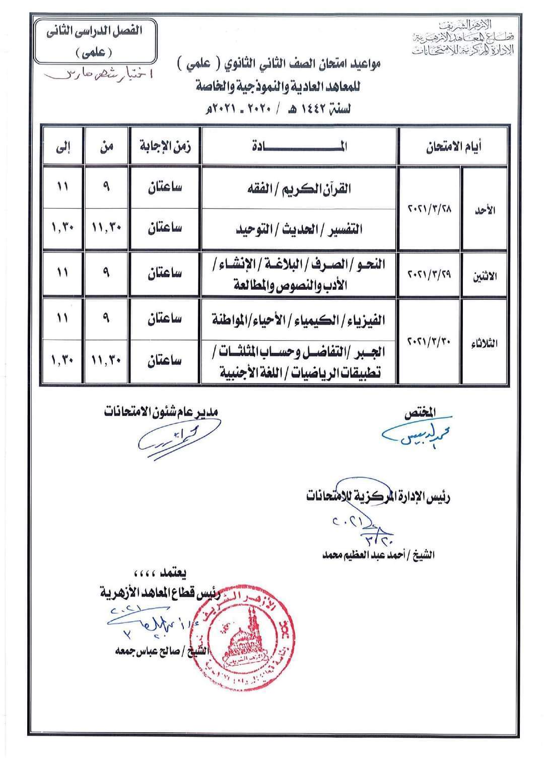 ولفت إلى التنبيه على المعاهد التي بها طلاب (العلوم الإسلامية) الصف الثاني الثانوي بوضع أسئلة شهر مارس 2021 م، بالنسبة إلى المواد الخاصة بطلاب العلوم الإسلامية وباقي المواد کزملائهم في الصف وذلك داخل كل معهد.