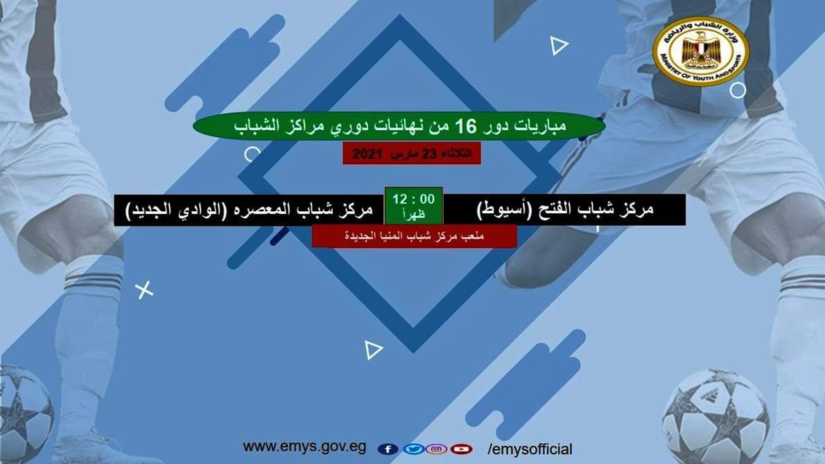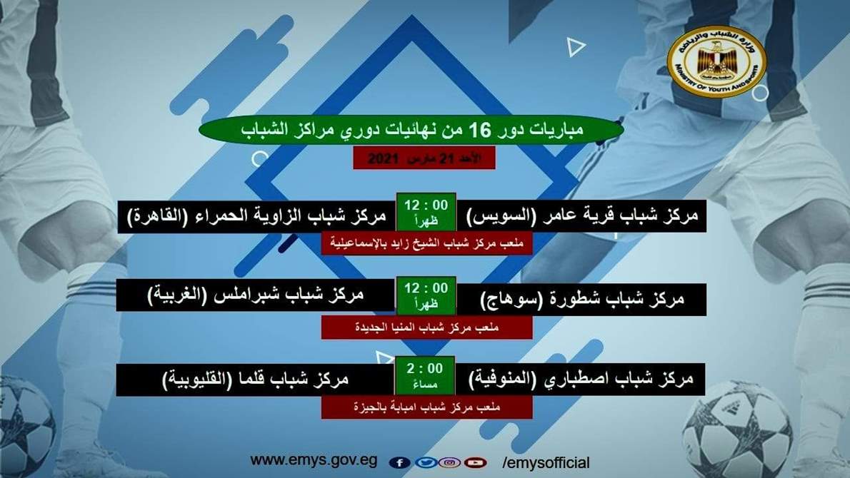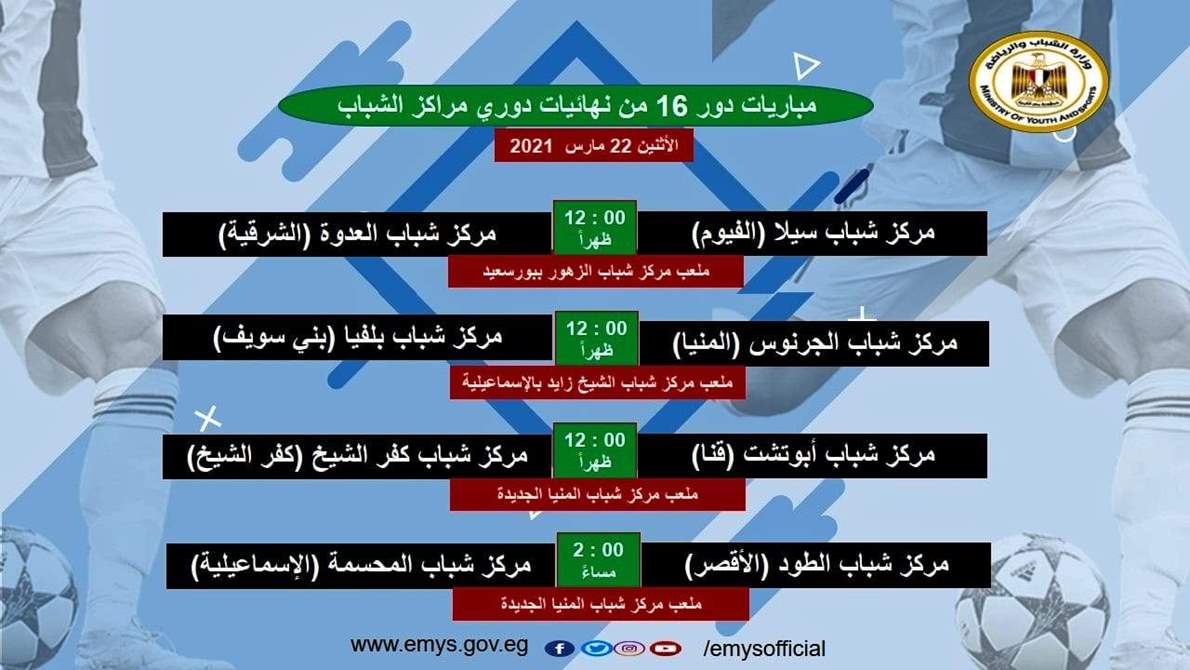 أعلنت وزارة الشباب والرياضة من خلال الإدارة المركزية لمراكز الشباب والهيئات الشبابية واللجنة المنظمة لدوري مراكز الشباب النسخة الثامنة، جدول منافسات دور 16 من البطولة.