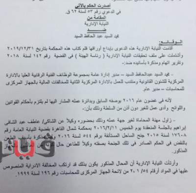 أصدرت المحكمة التأديبية العليا بمجلس الدولة حكمها في القضية رقم 53 لسنة 62 قضائية عليا بمجازاة مدير عام بالجهاز المركزي للمحاسبات بعد ثبوت ارتكابه مخالفات إدارية وقانونية جسيمة وأدى عملًا للغير دون إذن رئاسته.