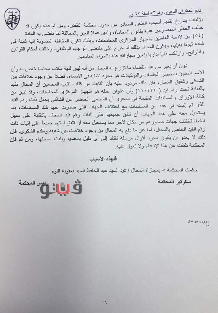 وكان رئيس هيئة النيابة الإدارية تلقى بلاغًا من رئيس الجهاز المركزي للمحاسبات بشأن شكوى المواطن عاطف عبد الشافي إبراهيم يتضرر فيها من ممارسة المحال لأعمال المحاماة رغم كونه عضوًا بالجهاز.