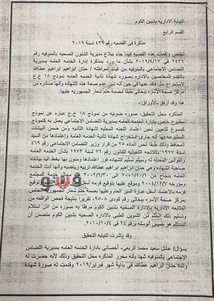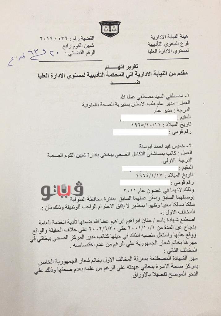 وكانت النيابة الإدارية تلقت بلاغًا من مديرية الشئون الصحية بالمنوفية رقم 2437 في 17 ابريل 2019 بشأن ما ورد بمذكرة إدارة الخدمة العامة بمديرية التضامن الإجتماعي بالمحافظة للتحقيق في واقعة التزوير، وأنتهت التحقيقات إلى إحالة المخالفين للمحاكمة وطلبت النيابة الإدارية من رئيس المحكمة تحديد أقرب جلسة لنظر القضية.