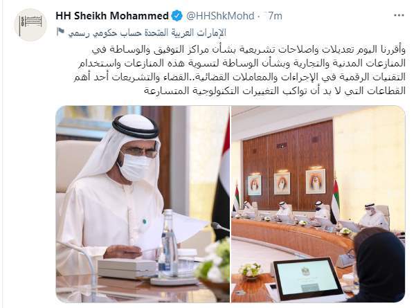 وأضاف "وأقررنا اليوم تعديلات واصلاحات تشريعية بشأن مراكز التوفيق والوساطة في المنازعات المدنية والتجارية وبشأن الوساطة لتسوية هذه المنازعات واستخدام التقنيات الرقمية في الإجراءات والمعاملات القضائية..القضاء والتشريعات أحد أهم القطاعات التي لا بد أن تواكب التغييرات التكنولوجية المتسارعة"