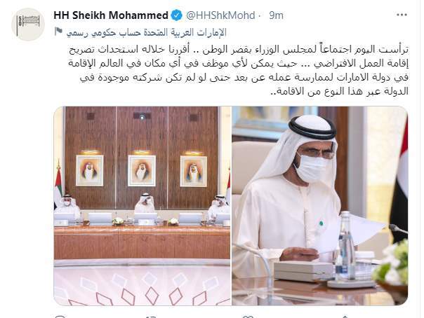 وكتب محمد بن راشد بن مكتوم "ترأست اليوم اجتماعاً لمجلس الوزراء بقصر الوطن .. أقررنا خلاله استحداث تصريح إقامة العمل الافتراضي ... حيث يمكن لأي موظف في أي مكان في العالم الإقامة في دولة الامارات لممارسة عمله عن بعد حتى لو لم تكن شركته موجودة في الدولة عبر هذا النوع من الإقامة.."