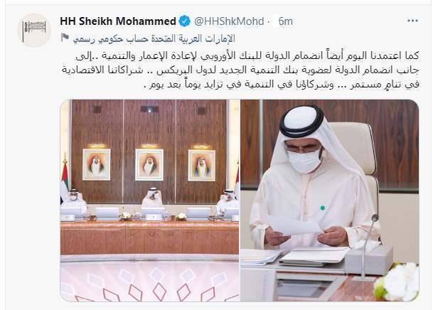 وقال "كما اعتمدنا اليوم أيضاً انضمام الدولة للبنك الأوروبي لإعادة الإعمار والتنمية ..إلى جانب انضمام الدولة لعضوية بنك التنمية الجديد لدول البريكس .. شراكاتنا الاقتصادية في تنامٍ مستمر ... وشركاؤنا في التنمية في تزايد يوماً بعد يوم"
