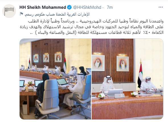 وتابع الشيخ محمد بن راشد "واعتمدنا اليوم نظاماً وطنيا للمركبات الهيدروجينية .. وبرنامجاً وطنياً لإدارة الطلب على الطاقة والمياه لتوحيد الجهود وخاصة في مجال ترشيد الاستهلاك والهدف زيادة الكفاءة ٤٠٪ لأهم ثلاثة قطاعات مستهلكة للطاقة (النقل والصناعة والبناء ).."